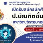 กันยายน 5, 2025รับสมัครและสอบคัดเลือกบุคคลเข้าศึกษา ระดับประกาศนียบัตรบัณฑิตชั้นสูง สาขาวิชานวัตกรรมการศึกษา ภาคพิเศษ ภาคการศึกษาที่ 2 ปีการศึกษา 2568